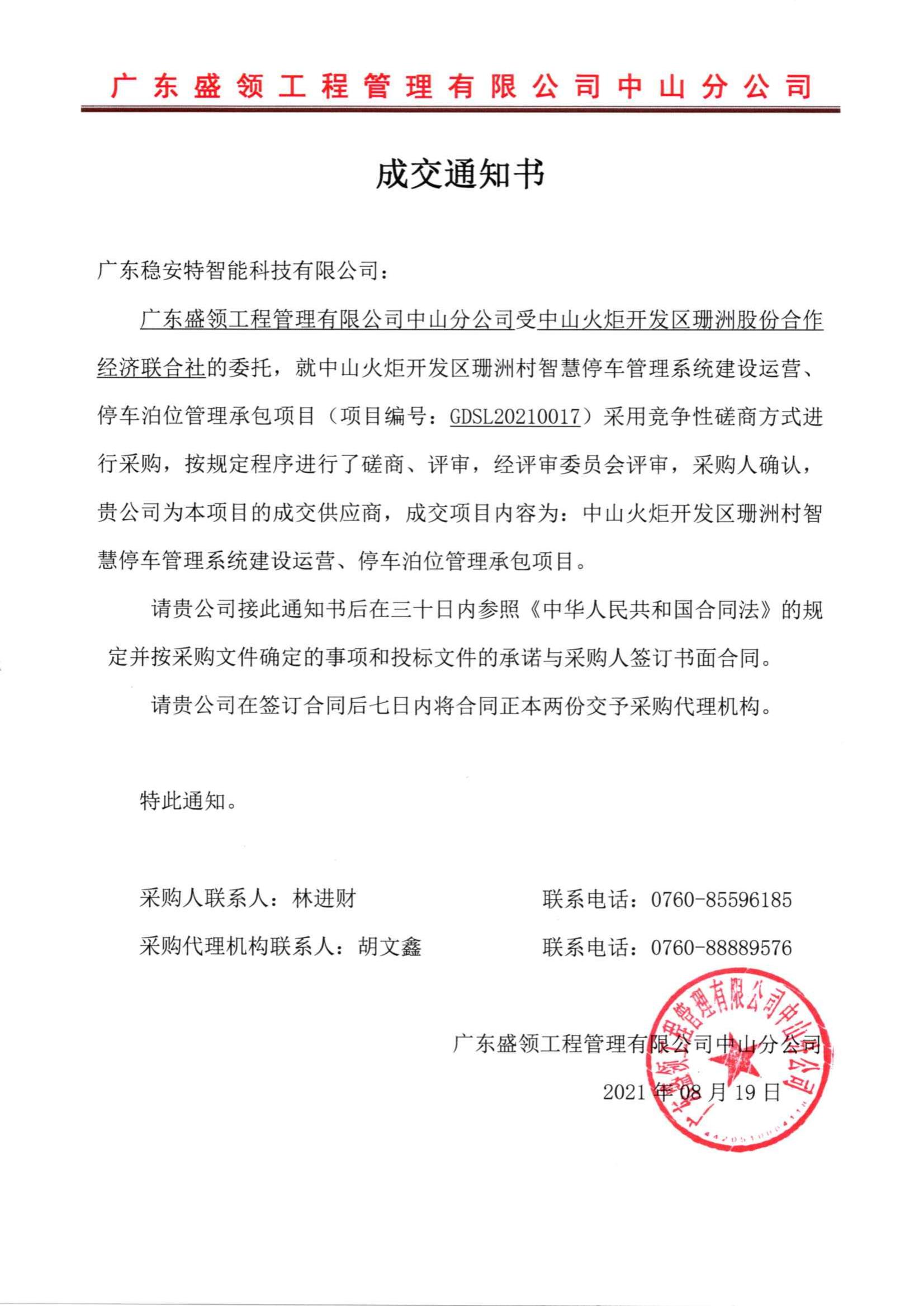 稳安特中标中山市火炬开发区珊洲村智慧停车管理项目
